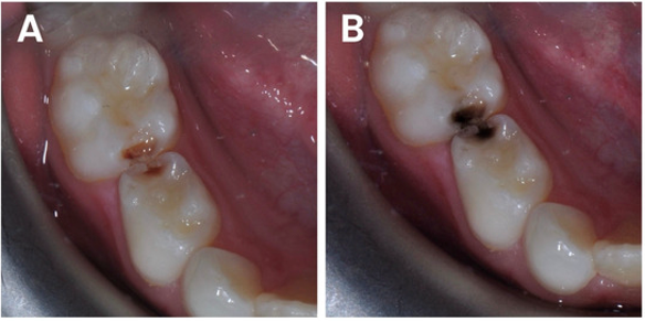 The decayed area of the tooth will turn dark black. This is a normal sign that the SDF is working. Healthy tooth structure does not stain.